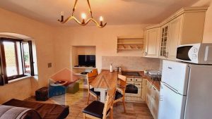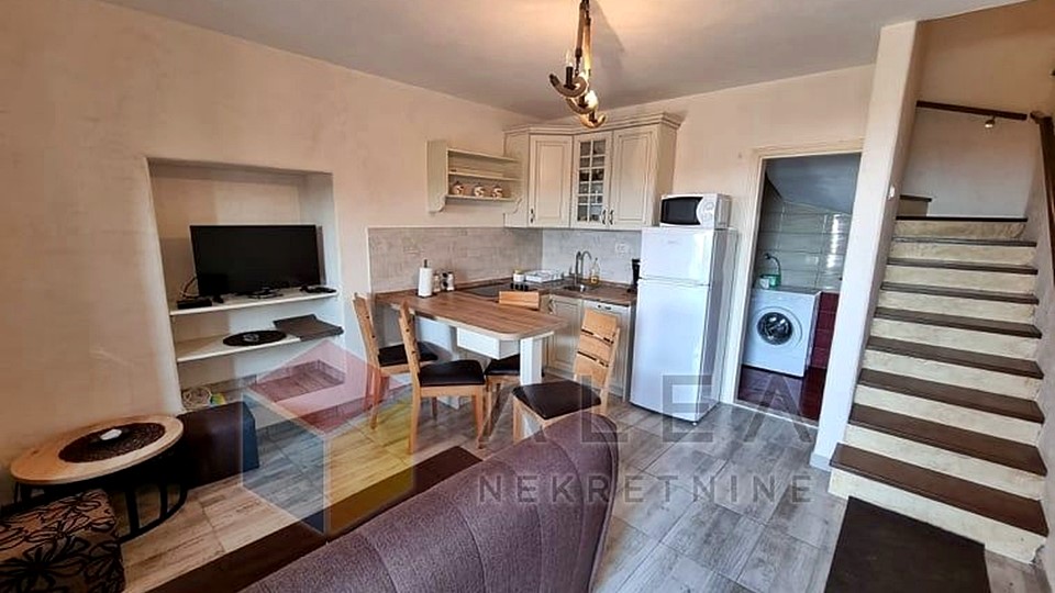 Taj je apartman ukupne površine 43,43 m2 u potpunosti renoviran i opremljen a raspoređen je na dvije etaže.