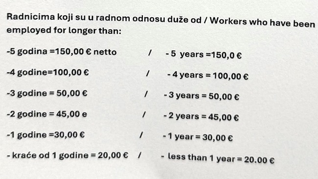 Naime, tamo je donesen pravilnik prema kojem su zaposleni manje od godine dana primili „božićnicu“ u iznosu od – 20 eura.