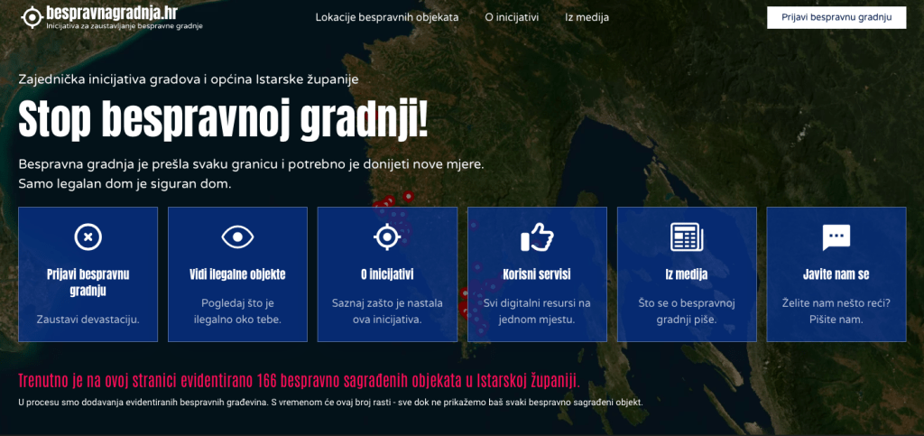 Kako piše današnji Glas Istre, ukupno 17 gradova i općina gdje je IDS na vlasti pokrenulo je stranicu bespravnagradnja.hr na kojoj će se objavljivati lokacije bespravno sagrađenih objekata i njihov ukupan broj, a građani će putem stranice moći jednostavno prijavljivati objekte na čiju legalnost sumnjaju.