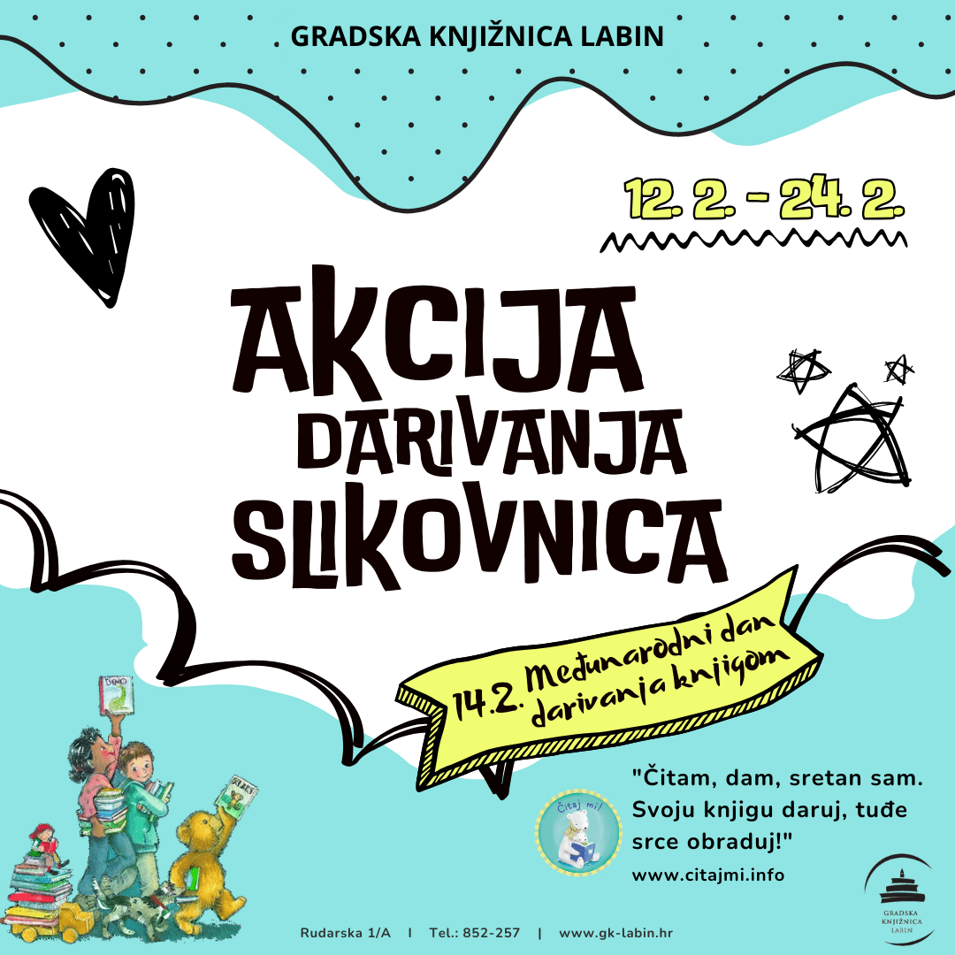 Povodom Međunarodnog dana darivanja knjigom koji se svake godine diljem svijeta obilježava 14. veljače, Gradska knjižnica Labin i ove se godine pridružuje akciji prikupljanja slikovnica i knjiga za djecu u okviru nacionalne kampanje „Čitaj mi!“, pod sloganom „Čitam, dam, sretan sam – svoju knjigu daruj i tuđe srce obraduj!“.