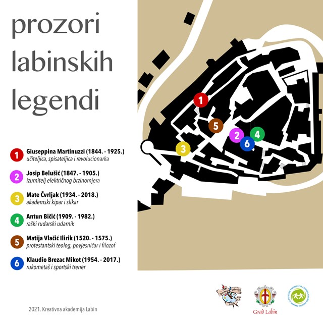 Ipak, u sklopu projekta “Prozori labinskih legendi” građani su kroz anketu odabrali svoje favorite, a stručno je povjerenstvo dodalo nekoliko svojih, tako da će nas kroz “prozore” u slijepim otvorima na javnim zgradama labinskog starog grada od danas gledati šest iznimno značajnih osoba iz labinske prošlosti: učiteljica, spisateljica i revolucionarka Giuseppina Martinuzzi, Josip Belušić, izumitelj električnog brzinomjera, veliki kipar Mate Čvrljak, rudar i udarnik Antun Bičić, najpoznatiji Labinjan izvan granica Hrvatske Matija Vlačić Ilirik, te rukometna legenda Klaudio Brezac Mikot.