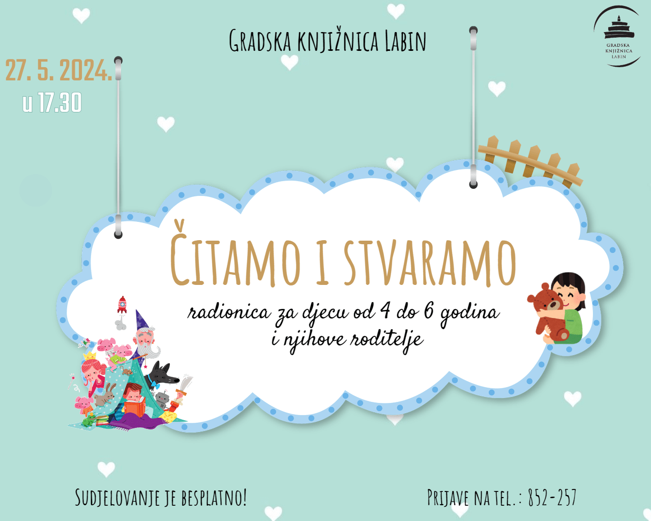 Gradska knjižnica Labin poziva sve male knjigoljupce i kreativce na novo druženje u okviru programa “Čitamo i stvaramo” u ponedjeljak, 27. svibnja 2024. u 17.30 u Dječjem odjelu Knjižnice.