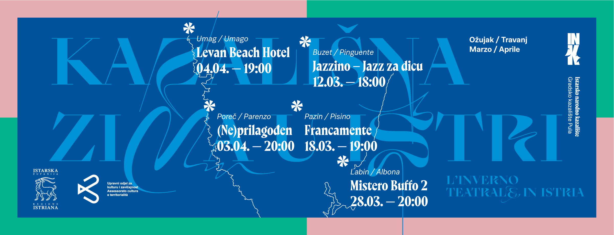 Projekt Kazališna zima u Istri / L’inverno teatrale in Istria financiran je sredstvima Istarske županije / Regione Istriana kroz program Upravnog odjela za kulturu i zavičajnost / Assessorato alla cultura e territorialità.