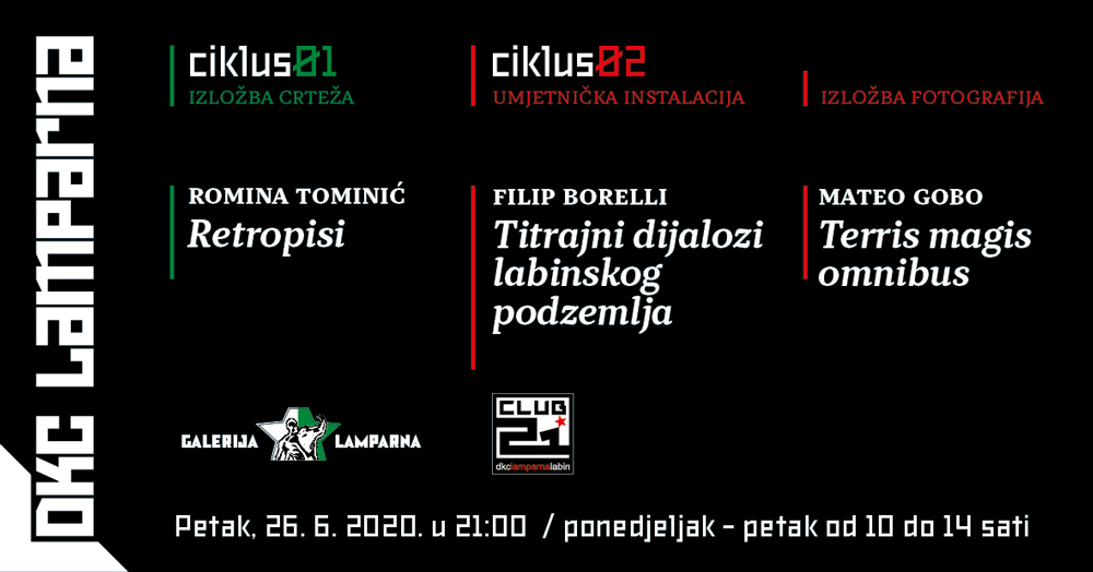 Sve tri izložbe otvaraju se u petak, 26. lipnja u 21 sat i ostaju otvorene do 10. srpnja 2020., radnim danom (ponedjeljak – petak) od 10 – 14 sati.