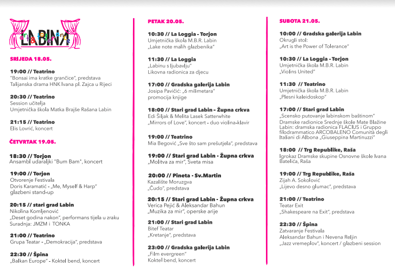 Sutra, u četvrtak i službeno započinje Festival umjetnosti i tolerancije LABINA, koji će se održati u starogradskoj jezgri Grada Labina na raznim lokacijama.