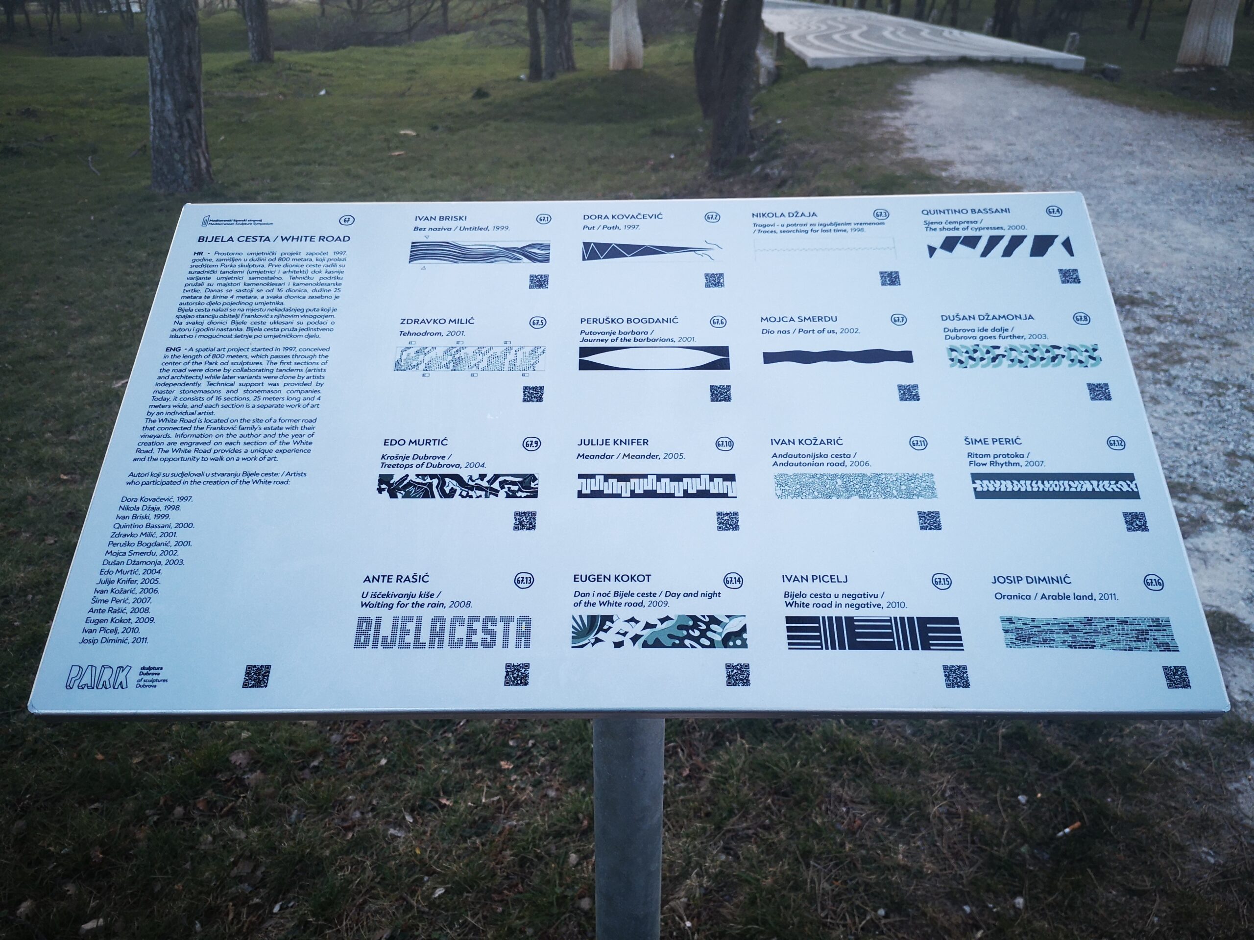 Autori dionica Bijele ceste su Dora Kovačević, Nikola Džaja, Ivan Briski, Quintino Bassani, Zdravko Milić, Peruško Bogdanić, Mojca Smerdu, Dušan Džamonja, Edo Murtić, Julije Knifer, Ivan Kožarić, Šime Perić, Ante Rašić, Eugen Kokot, Ivan Picelj i Josip Diminić. Postavljanjem informativne table posjetitelji mogu dobiti uvid o autorima dionica kroz očitavanje QR koda koji vodi na službenu web stranicu Parka skulptura gdje se može naći više informacija i fotografija o pojedinom autoru i dionici, a moguće je poslušati i audiovodič te pogledati videe o nastanku pojedinih dionica.