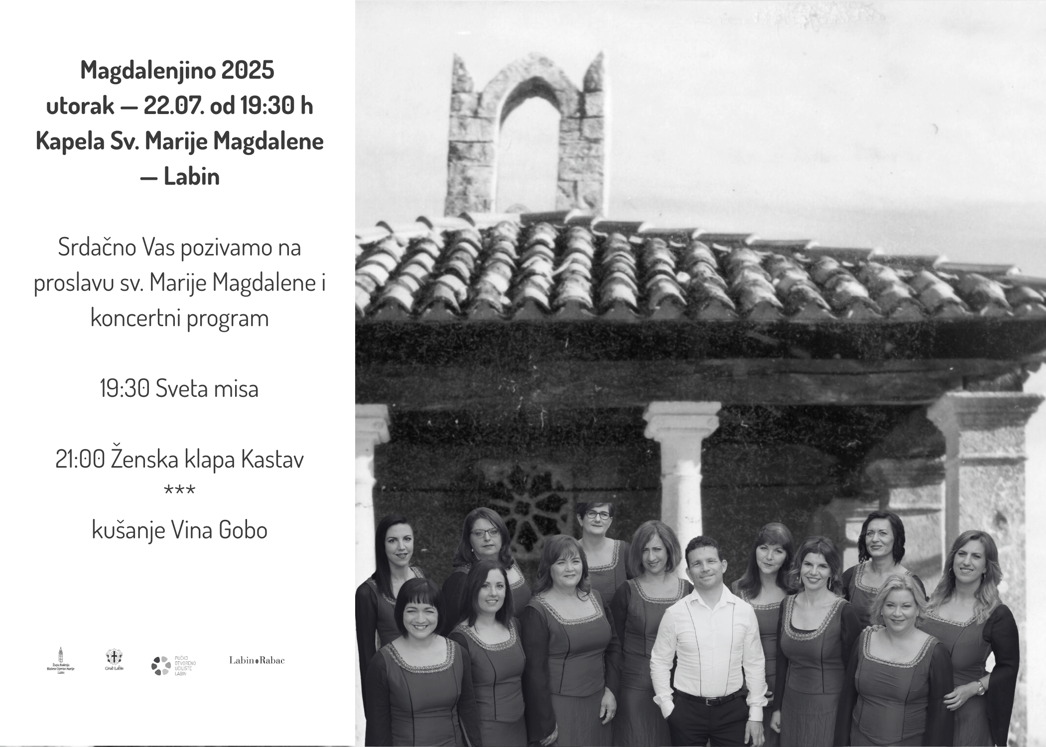 Proslava započinje svetom misom koja će se održati u mirnom okruženju Kapele sv. Marije Magdalene, koja datira iz 17. stoljeća. Kapela je smještena na brežuljku s prekrasnim pogledom na grad Labin i okolna naselja. Iako nije često korištena za veće duhovne skupove, kapela je i dalje značajan povijesni objekt, poznat po svojoj jednostavnoj, ali tipičnoj istarskoj arhitekturi. Posvećena je sv. Mariji Magdaleni, a svojom poviješću i lokacijom odražava duhovnu povezanost ovog kraja s tradicijama i vjerovanjima. - Koncert ženske klape Kastav – 21:00 na vidikovcu iznad kapele