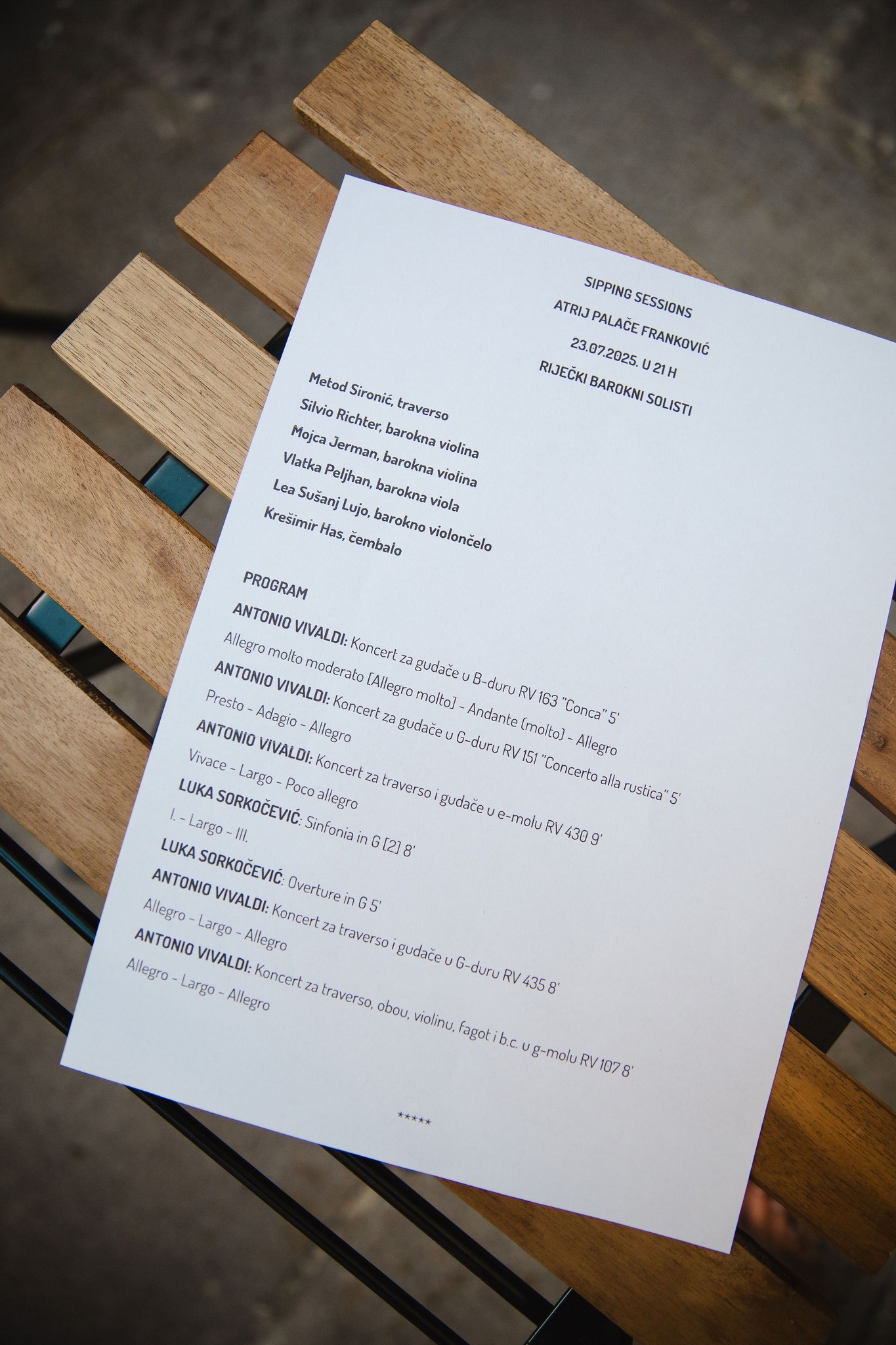 U bajkovitom ambijentu atrija palače Franković sinoć je održan koncert Riječkih baroknih solista, koji su publiku poveli na glazbeno putovanje kroz raskošnu epohu baroka. Koncert je započeo u 21 sat i okupio brojne ljubitelje klasične glazbe, povijesti i enologije.