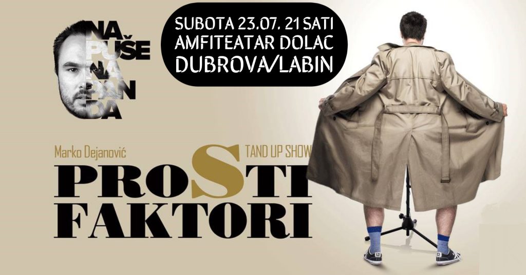 Nakon vrlo uspješne izvedbe stand-up komedije “Brak, dijete i povremeni seks” koju je održao u lipnju, ove subote, 23. srpnja komičar Marko Dejanović ponovo dolazi u amfiteatar Dolac Parka skulptura Dubrova. Ovog će puta izvesti svoju drugu stand-up predstavu naziva “Prosti Faktori”.