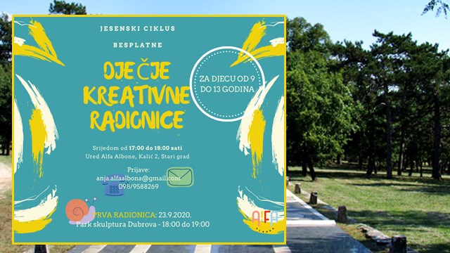 Radionica na otvorenom u sklopu 42. Mediteranskog kiparskog simpozija, uvertira je kojom Alfa Albona najavljuje nastavak dječjih kreativnih radionica. Radionica će se održati u srijedu, 23. rujna 2020. godine u vremenu od 18:00 do 19:00 sati u Parku skulptura Dubrova.