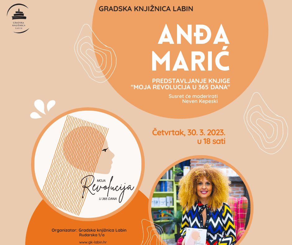 U četvrtak, 30.3.2023. s početkom u 18 sati Gradska knjižnica Labin ugostit će poznatu glazbenicu i spisateljicu Anđu Marić koja će ovom prigodom predstaviti svoju knjigu „Moja revolucija u 365 dana“.