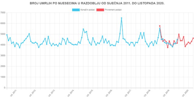 „Ukupan broj umrlih od siječnja do listopada 2020. pao je za 0,5% u odnosu na isto razdoblje prethodne godine, odnosno umrlih je bilo 232 manje.