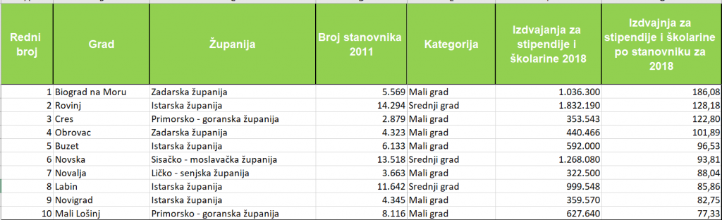 Portal gradonačelnik.hr objavio je istraživanje o izdvajanjima hrvatskih gradova za potrebe stipendiranja svojih sugrađana. Grad Labin u top je deset gradova u Hrvatskoj po visini izdvajanja za stipendije po glavi stanovnika za 2018. godinu.