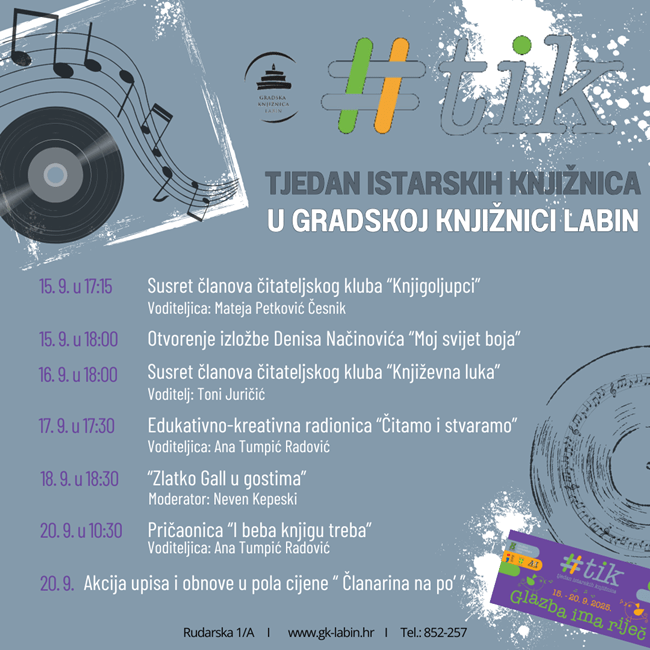 I Gradska knjižnica Labin pridružit će se svim istarskim knjižnicama te svojim programom obilježiti 7. po redu TIK koji već godinama jača vidljivost knjižnica, povezuje zajednicu i širi kulturnu ponudu u Istri – a ove godine glazba preuzima glavnu riječ!