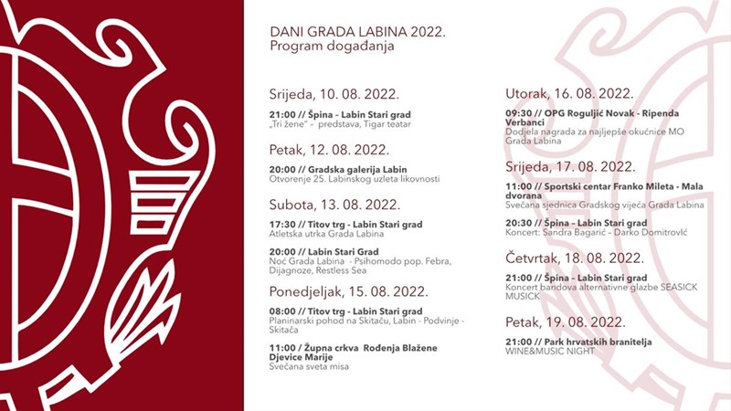 Sredinom kolovoza, uz iznimku posljednje dvije neuobičajene pandemijske godine, nizom se događanja obilježavaju Dani Grada Labina. U nadi da će ovaj povratak u „normalu“ potrajati, Grad Labin je i ove godine pripremio raznovrstan i šarolik program obilježavanja svoga dana.