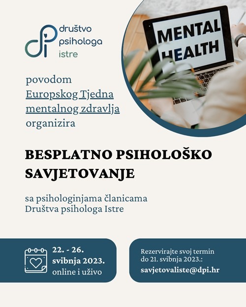 S ciljem lokalnog djelovanja i promocije mentalnog zdravlja, psihologinje članice DPI-ja nude svoje vrijeme i znanje građanima/kama u ukupno 16 termina* besplatnog savjetodavnog razgovora u trajanju od 60 minuta, u tjednu od 22. do 26. svibnja 2023. online i uživo.