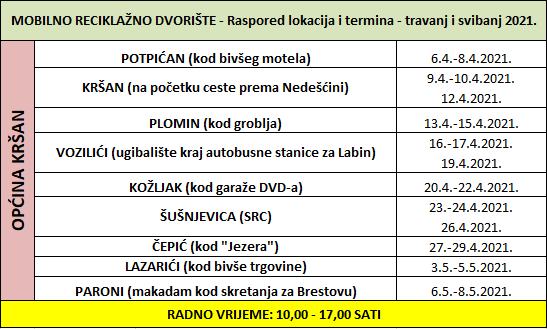 Komunalno društvo 1. Maj obavještava stanovnike Općine Kršan da će idući tjedan krenuti proljetni obilazak mobilnog reciklažnog dvorišta (MRD) na teritoriju općine. Prva lokacija biti će Potpićan, i to kod bivšeg motela. Tu lokaciju s mobilnim reciklažnim dvorištem posjetit će od utorka do četvrtka (od 6. do 8. travnja), a radno vrijeme je od 10:00 do 17:00 sati.