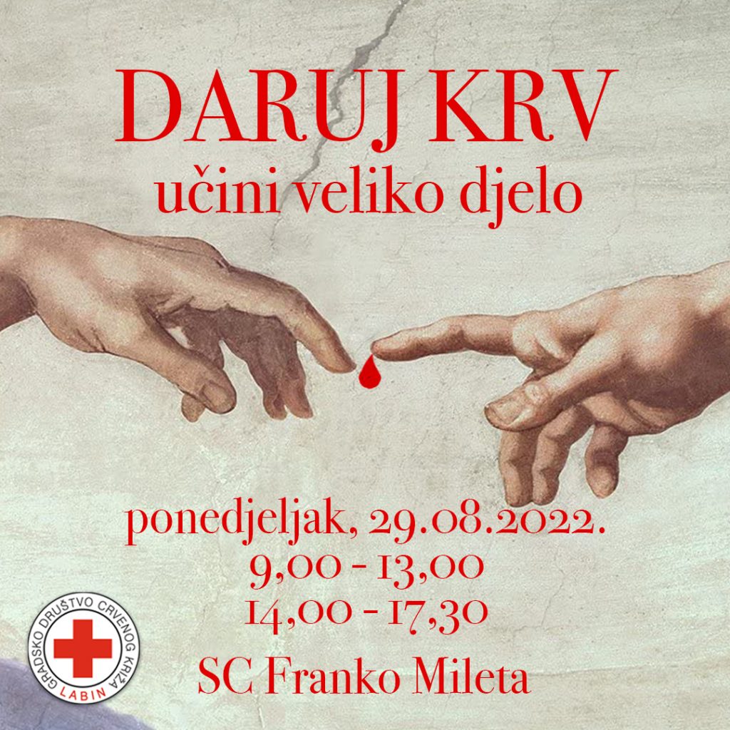 Crveni križ Labin obaviještava o novom terminu akcije darivanja krvi u Labinu koja će se održati u ponedjeljak, 29.8.2022., od 9:00 do 13:00 i od 14:00 do 17:30 sati u prostoru Fitness dvorane Sportskog centra Franko Mileta.