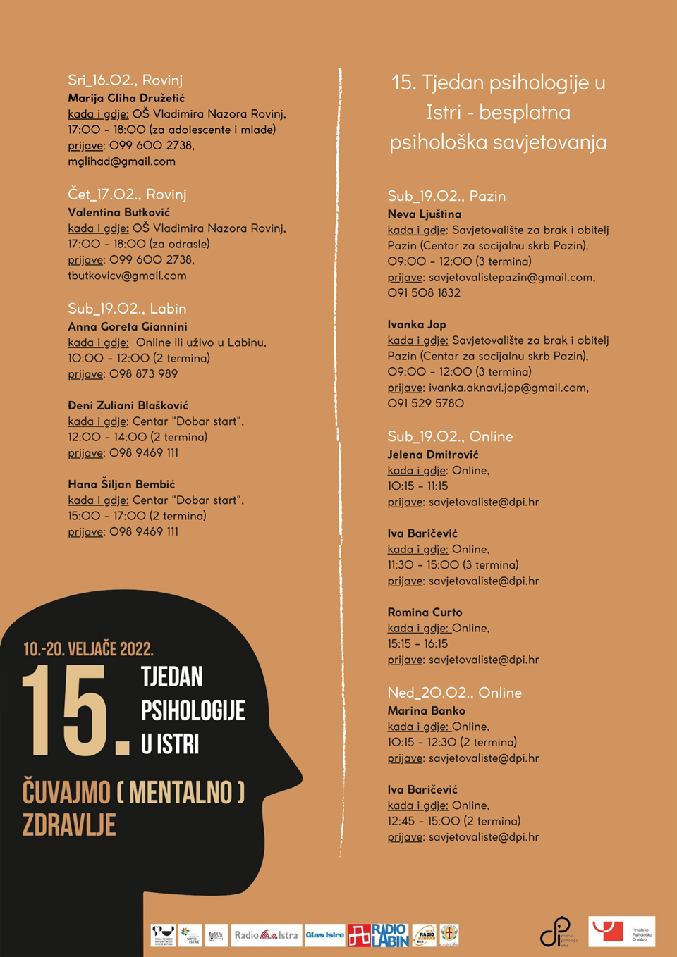 Zahvaljujemo i svim medijima koji će nas popratiti u najavama i kroz 15. tjedan psihologije. Sva događanja u 15. Tjednu psihologije za publiku su besplatna!”, poručili su iz Društva psihologa Istre.