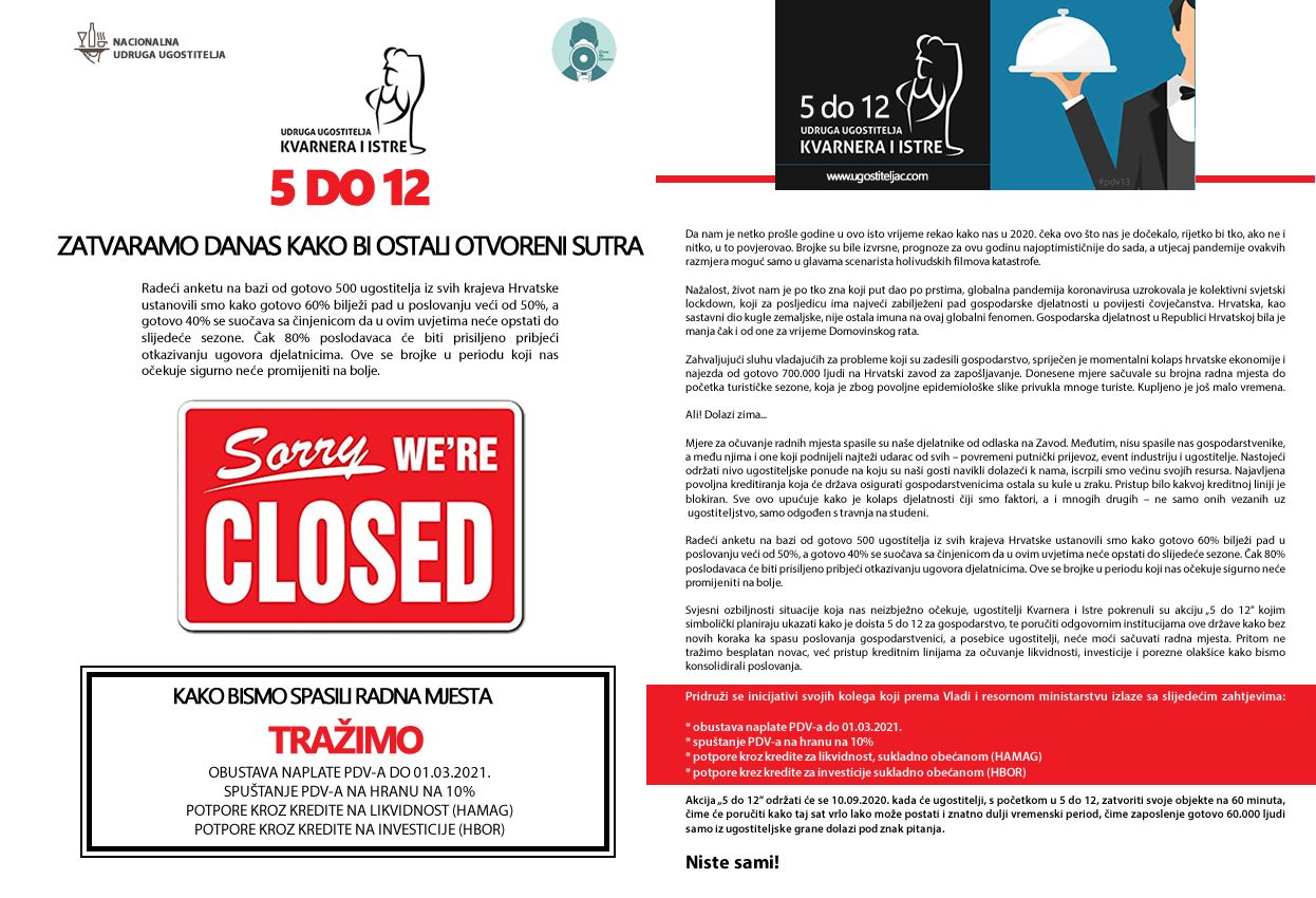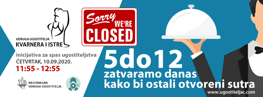 Ugostitelji Istre i Kvarnera ovog četvrtka zajednički organiziraju akciju pod nazivom “5 DO 12″, u sklopu koje će ugostiteljski objekti biti zatvoreni od 11:55 do 12:55 sati.