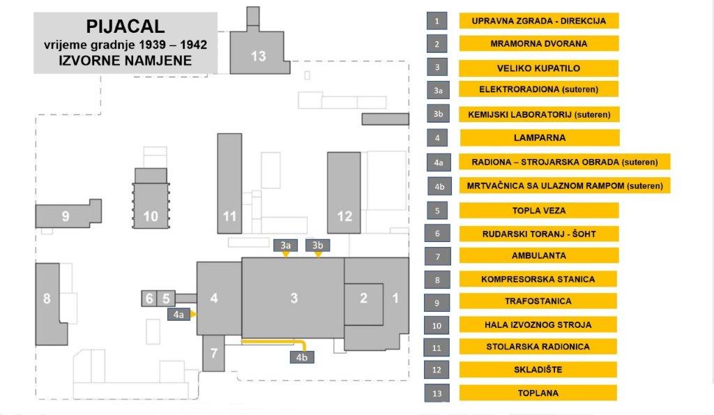Zanimljiva je sama povijest našeg rudarskog kompleksa koji je obuhvaćen terminom Pijacal (od tal. piazzale, u značenju trga, omeđene prostrane površine). Izgradnja kompleksa započela je u razdoblju od 1938. do 1942. godine. Rudarsko – industrijski kompleks čine izvozni rudarski toranj „Šoht“ s toplom vezom i podzemne jamske prostorije, arhitektonski sklop upravne zgrade s centralnom garderobom rudara i kupaonom, lamparnom, kemijskim laboratorijem, elektroradionom, prostorom strojne obrade i skladištem, te ambulantom i mrtvačnicom, zatim glavnim i pomoćnim izvoznim strojem, starom i novom trafostanicom, kompresorskom stanicom, zgradom hladnjaka, skladištem pijeska i tehničkih plinova, bravarija, stolarska radiona te nešto sjevernije i termocentralom.