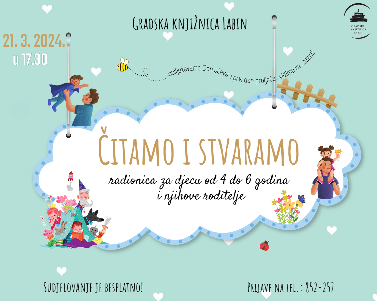 Gradska knjižnica Labin poziva sve male knjigoljupce i kreativce na novo druženje u okviru programa “Čitamo i stvaramo” u četvrtak, 21. ožujka 2024. u 17.30 u Dječjem odjelu Knjižnice. Radionica će biti posvećena obilježavanju Dana očeva i prvog dana proljeća. Prisutne očekuje prekrasna priča o posebnoj vezi oca i kćeri, a za kreativan rad inspiraciju će potražiti u mirisima i zvukovima proljeća.