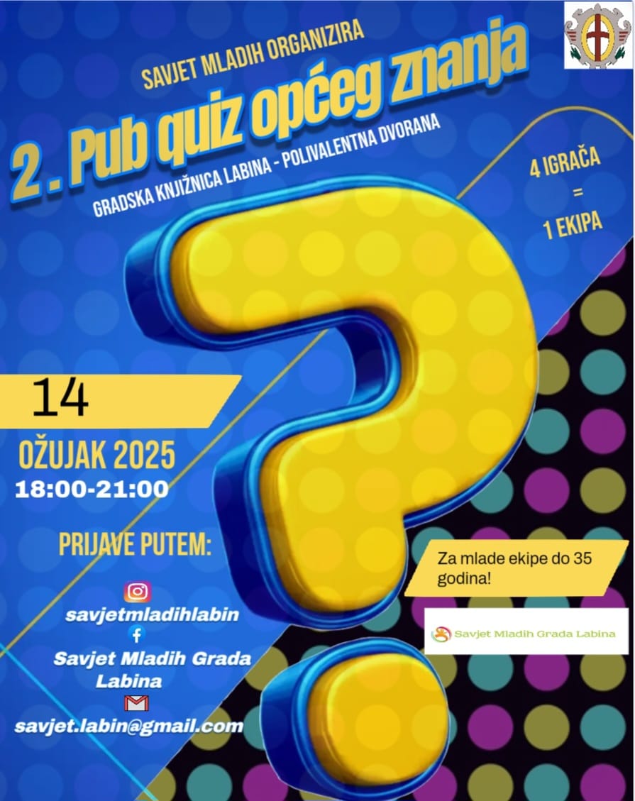 Savjet mladih Grada Labina organizira 14. ožujka Drugi Pub quiz općeg znanja u Polivalentnoj dvorani Gradske knjižnice Labin.