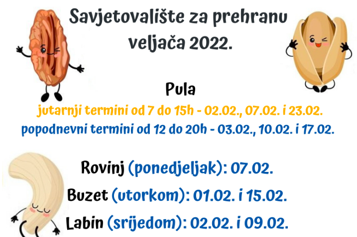U veljači će Savjetovalište raditi u srijedu 9. veljače od 13.00 do 19.00 sati, a više informacija o Savjetovalištu za prehranu možete dobiti na tel. 052/529-022, 099/380-4545 ili e-mail: savjetovaliste@zzjziz.hr te facebook stranici.