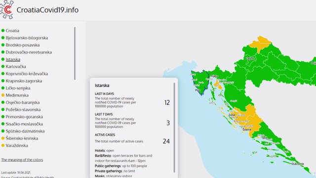 HUT svakog dana ažurira epidemiološku kartu Hrvatske, croatiacovid-19.info, koja pokazuje epidemiološko stanje u zemlji po županijama i otocima. Karta pokazuje na jednom mjestu sve ključne standardizirane pokazatelje kretanja epidemiološkog stanja u zemlji – dnevni broj novo oboljelih, incidenciju na 100.000 stanovnika u posljednjih 14 i u posljednjih 7 dana, broj aktivnih slučajeva te udio pozitivnih među ukupno testiranima u posljednjih sedam dana. Uz to, prikazane su i ključne mjere koje se odnose na ugostiteljstvo, radno vrijeme i ostale važne mjere za turiste, i to na nacionalnoj razini, ali i na razini pojedinih županija. Potrebne informacije HUT-u redovno dostavljaju Nacionalni stožer civilne zaštite, Ministarstvo unutarnjih poslova, Hrvatski zavod za javno zdravstvo i Hrvatski zavodu za zdravstveno osiguranje.