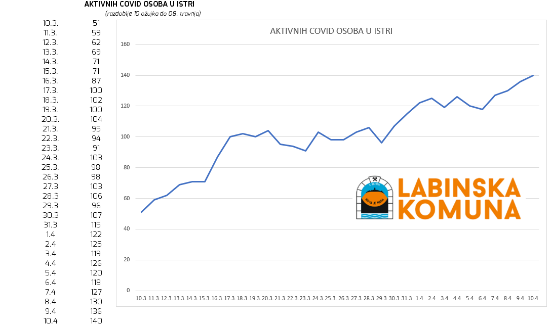 U mjerama samoizolacije nalazi se 1557 osoba. U Općoj bolnici Pula, na Odjelu za infektologiju, na liječenju je 69 osoba, a od toga se 8 osoba se nalazi u respiracijskom centru. Nažalost, u Općoj bolnici Pula preminule su tri COVID-19 pozitivne osobe (1924., 1944. i 1946. godište) s pridruženim kroničnim bolestima.