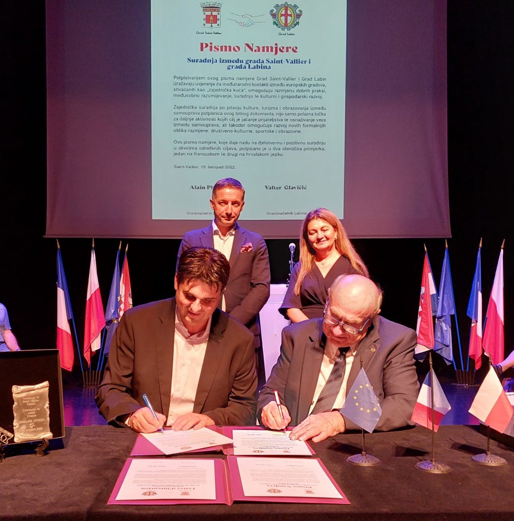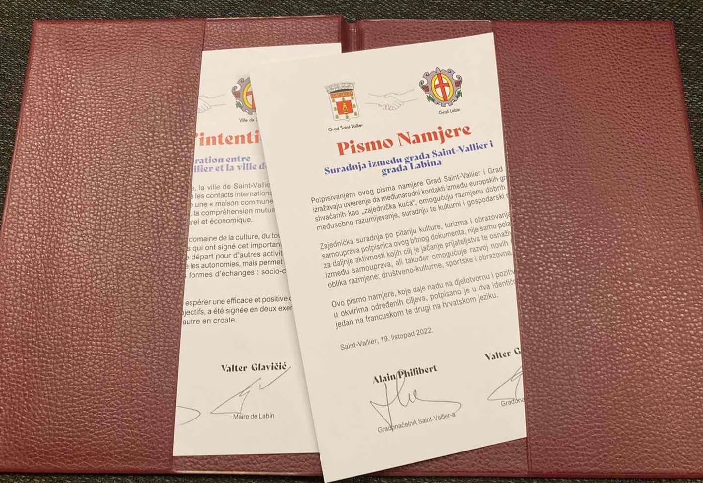 Sinoć je na svečanosti u kulturnom centru „Louis Aragon“ koja je održana povodom 60 godina bratimljenja Saint-Valliera i poljskog Rybnika, gradonačelnik Valter Glavičić potpisao pismo namjere o budućoj suradnji Labina i Saint-Valliera s gradonačelnikom Alainom Philibertom. Čin potpisivanja pisma namjere labinskog gradonačelnika s gradonačelnikom ovog francuskog grada sudeći po reakcijama prisutnih u prepunom kulturnom centru, ali i najavama diljem grada, prepoznata je kao jedna velikih stvari na putu razvoja industrijske baštine s obzirom da je Labin izuzetno cijenjen u širim europskim krugovima kao grad koji iznimne napore ulaže u razvoj i realizaciju projekata vezanih za svoju rudarsku povijest.