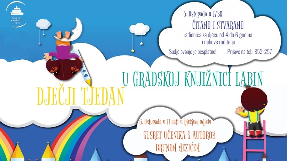 Za sudjelovanje u programu potrebna je prethodna prijava na broj telefona 852-257 ili osobno u Knjižnici. U četvrtak, 6. 10. u goste dolazi dječji autor Bruno Mezić. Za učenike prvih razreda labinskih osnovnih škola pripremio je zanimljivu radionicu „Kako nastaje priča“. Susret s autorom započinje u 11 sati u Dječjem odjelu Knjižnice.