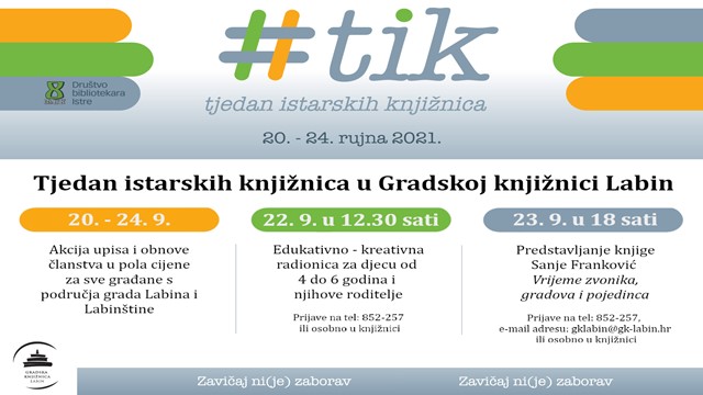 Tjedan istarskih knjižnica (20. – 24. 9.) manifestacija je u organizaciji Društva bibliotekara Istre pokrenuta s ciljem stavljanja knjižnica u fokus čitatelja, članova i korisnika knjižnica, građana uopće, kroz programe koji se odvijaju u istarskim knjižnicama. Treći po redu Tjedan posvećen je zavičajnim autorima. Provjerite tko je u Vašem gradu ili, još bolje, posjetite istarske knjižnice!