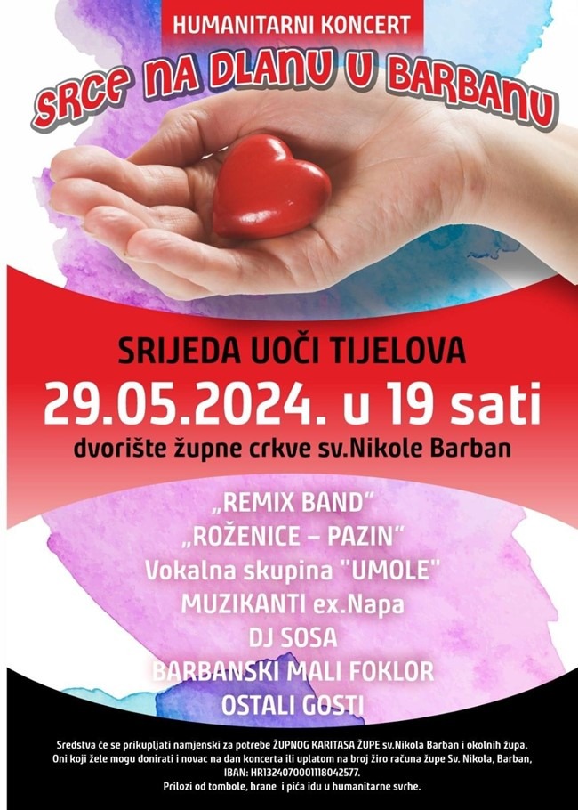 I ove godine, u srijedu 29. svibnja 2024. godine, uoči Tijelova, održati će se tradicionalni humanitarni koncert “Srce na dlanu” u Barbanu.