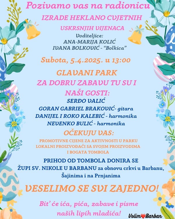 Posjetitelji će moći kupiti ručne radove na temu Uskrsa i poklončiće za najdraže jer zajednica VolimBarban podržava domaće proizvođače, a posebno žene poduzetnice i mlade koji tek pokreću vlastiti posao.