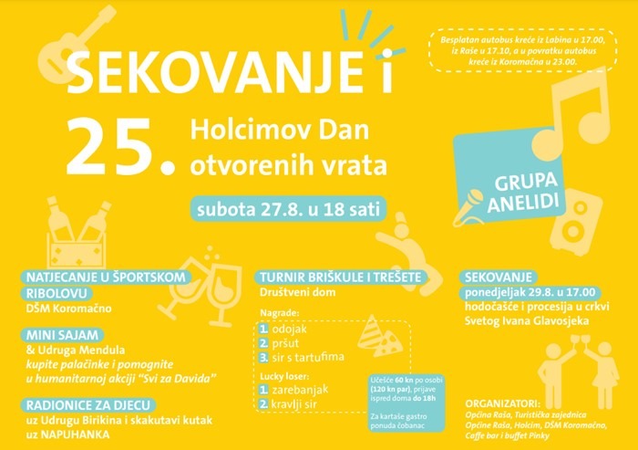 Sve je spremno za još jedno Sekovanje i 25. Holcimov Dan otvorenih vrata u Koromačnu, u subotu, 27.8 u 18 sati. Sekovanja je tradicionalna fešta koja se svake godine održava 29. kolovoza kada se slavi mučeništvo ili glavosjek sv. Ivana Krstitelja.