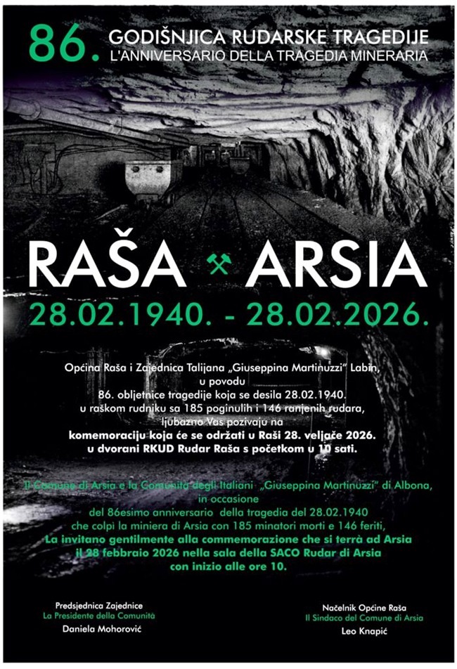 U povodu 86. obljetnice rudarske tragedije koja se dogodila 28. veljače 1940. godine u raškom rudniku, a u kojoj je život izgubilo 185 rudara, Općina Raša, Turistička zajednica Općine Raša i Zajednica Talijana ,,Giuseppina Martinuzzi” Labin organiziraju komemorativni program koji će se održati u subotu, 28. veljače 2026. godine, u Raši.