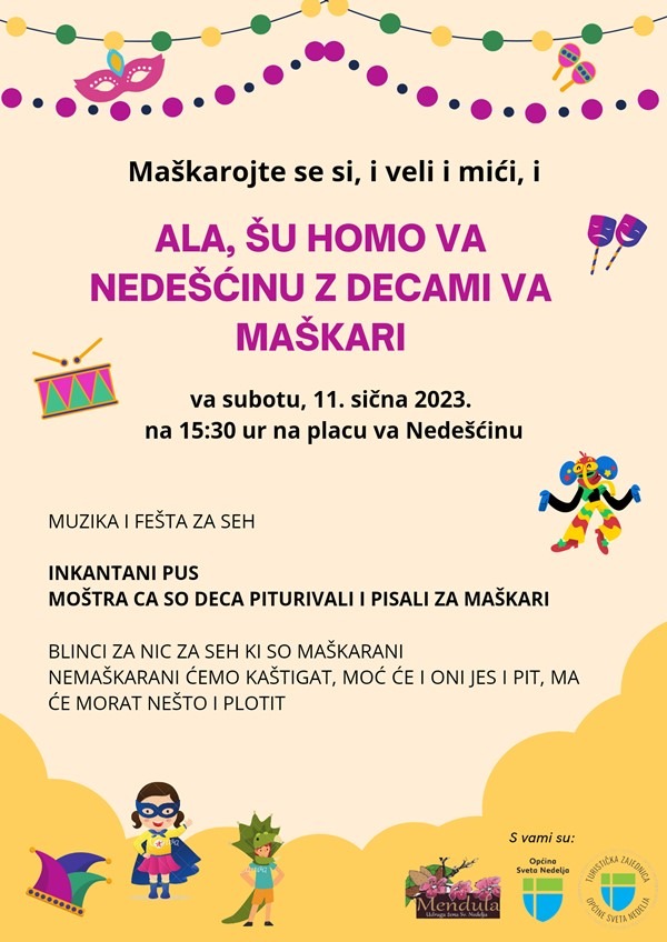 Udruga žena Sv. Nedelja „Mendula“, pod pokroviteljstvom Općine Sveta Nedelja i Turističke zajednice Općine Sveta Nedelja, poziva sve na karnevalsku povorku i dječji maskenbal „Ala, šu homo va Nedešćinu z decami va maškari“ u subotu, 11.veljače s početkom u 15:30 sati u Nedešćinu.