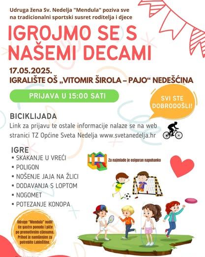 Udruga žena Svete Nedelje Mendula poziva sve zainteresirane 17. svibnja na tradicionalno sportsko druženje “Igrojmo se s našemi decami”!