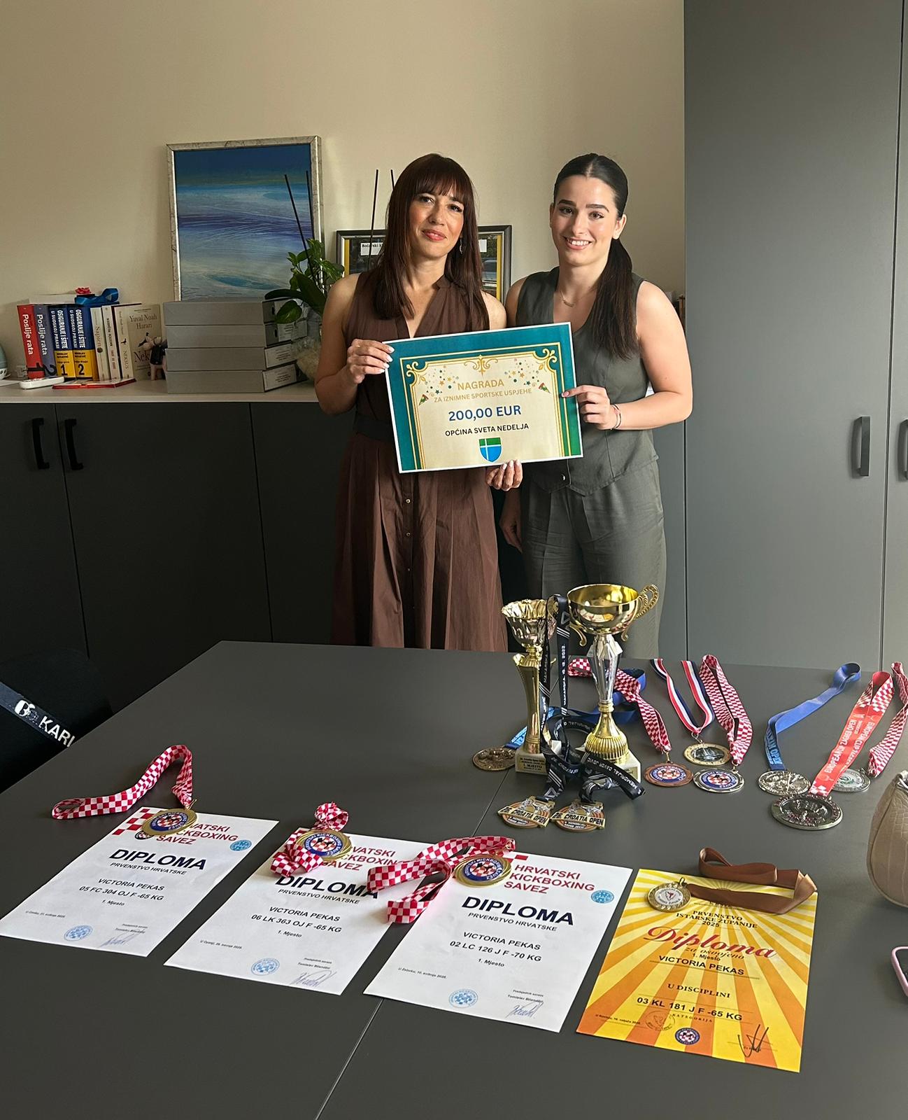 U prostorijama Općine Sveta Nedelja upriličen je prijem kod Općinske načelnice za Victoriu Pekas, mladu i iznimno uspješnu sportašicu u kickboxingu, kojoj je tom prigodom uručena novčana nagrada za uspješnost u iznosu od 200,00 eura.