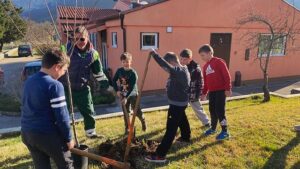 “U utorak, 2. ožujka 2021.g. učenici OŠ „ Ivo Lola Ribar“ Labin, PŠ Vozilići pridružili su se plemenitoj inicijativi Dani kolektivne sadnje drveća, eko akciji u suradnji s TZ Općine Kršan čiji je slogan Zasadi stablo, ne budi panj! U sadnji drveća sudjelovali su svi učenici naše škole od prvog do četvrtog razreda. Učenici su s velikim veseljem posadili sadnice voćke trešnje i šljive. Veliko hvala Općini Kršan koja nam je donirala sadnice i djelatnicima Komunalnog poduzeća 1.Maj Labin, gosp. Semiru Bojkiću i gosp. Vedranu Erženu koji su nam pomogli u sadnji i od kojih smo puno toga naučili. Veselimo se plodovima koje ćemo iskoristiti za izradu marmelada, džemova i kolača.