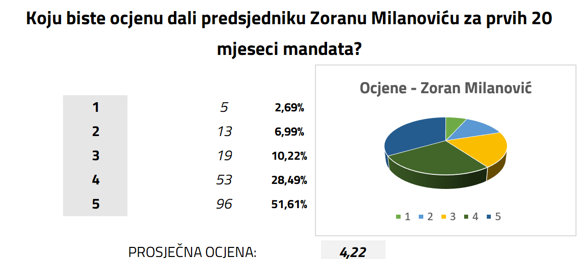 Naime, od 186 ispitanika, njih 96 Milanoviću je dalo ‘peticu’, dok je njih 53 predsjedniku ‘dalo’ četvorku. Zanimljivo, prosječna ocjena petom hrvatskom predsjedniku iznosi čak 4,22. Naravno, treba uzeti u obzir mali uzorak, ali svejedno, nije nepoznato kako Milanović na Labinštini uživa pozitivan status.