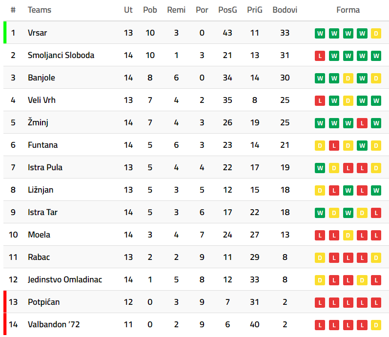 Nije dobro. Županijski prvoligaši s Labinštine, pogotovo Jedinstvo Omladinac, ne izgledaju najbolje. Potpićanci su veoma mladi, a uz to i neiskusni, pa njihovi porazi nisu senzacija, ali Nedešćani su kudikamo bolja momčad od onog što prikazuju. Zadovoljni ovog vikenda mogu biti Rapčani koje je Igor Munjas spasio poraza protiv odlične Funtane.