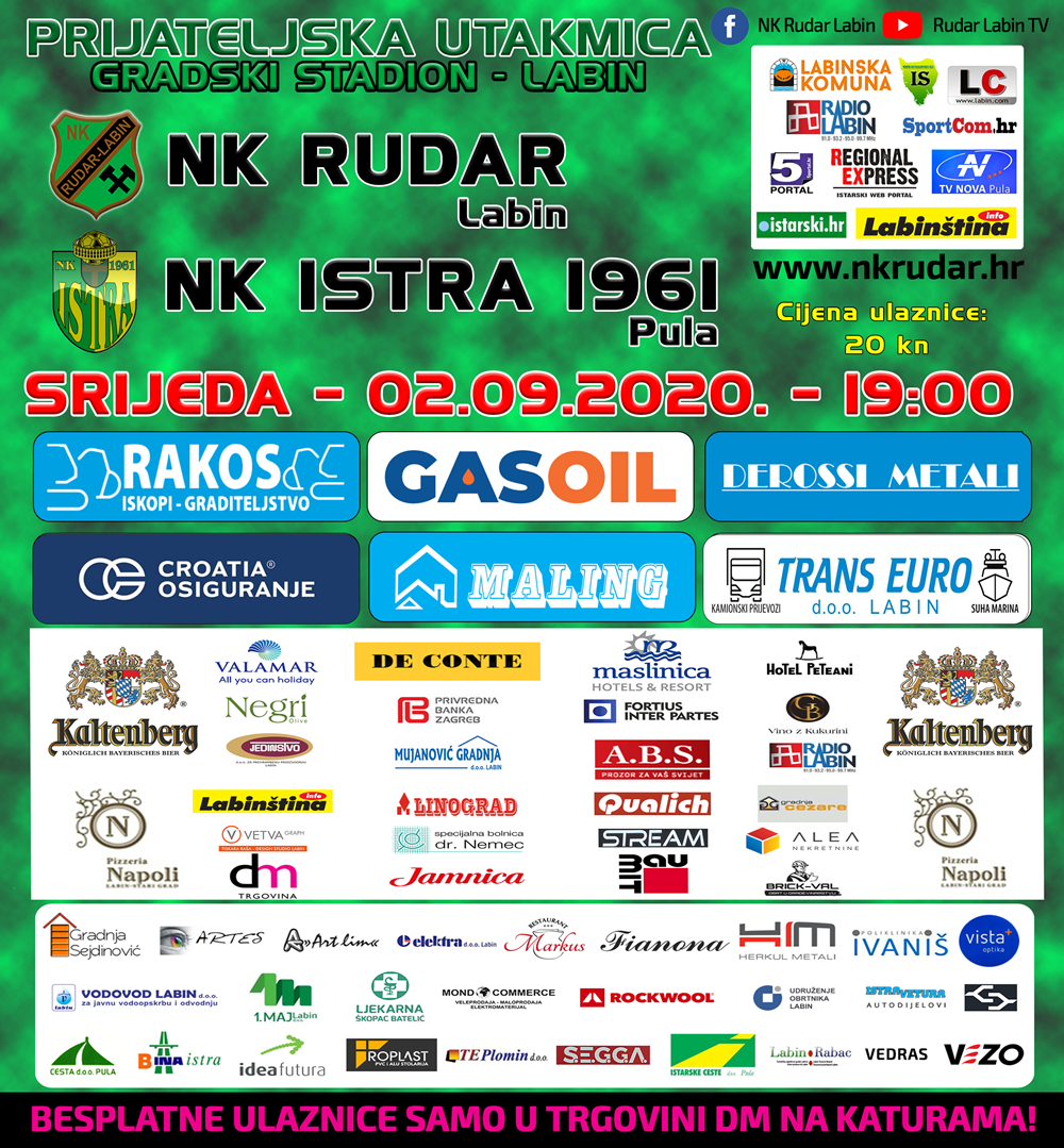 Sutra, u srijedu 02. rujna 2020. godine, na Gradskom stadionu u Labinu igra se prijateljska utakmica između domaćeg trećeligaša Rudara i prvoligaša Istre 1961. Utakmica je otvorena za javnost, ali se mole potencijalni gledatelji da na susret dođu s papirićem na kojem će pisati njihovo ime i prezime te kontakt broj.