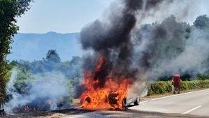 Danas oko 11 sati u Kršanu, na državnoj cesti D64, zapalilo se osobno vozilo. Uzrok požara još uvijek nije poznat, ali je plamen krenuo vrlo