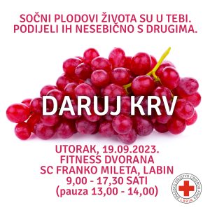 Iz Crvenog križa stigla je danas obavijest o novom o terminu akcije darivanja krvi u Labinu koja će se održati u utorak, 19.09.2023., od 9,00