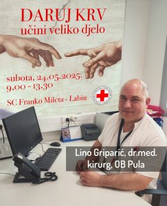 Crveni križ obavještava javnost o novom terminu akcije darivanja krvi u Labinu koja će se održati u petak, 11.04.2025., prema slijedećem rasporedu: – od 9,30-12,00