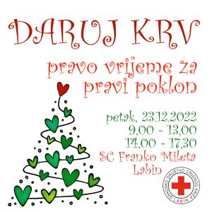 Iz Crvenog križa obavještavaju o novom terminu akcije darivanja krvi u Labinu koje će se održati u petak, 23.12.2022., od 9,00 do 13,00 i od