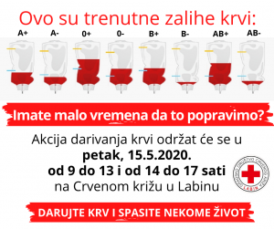 U petak akcija dobrovoljnog darivanja krvi Ana Tavić 12 svibnja, 2020 Gradsko društvo Crvenog križa Labin ovog petka, 15. svibnja u vremenu od 9,00 do 17,00 sati (uz pauzu od 13:00 do 14:00) organizira još jednu akciju